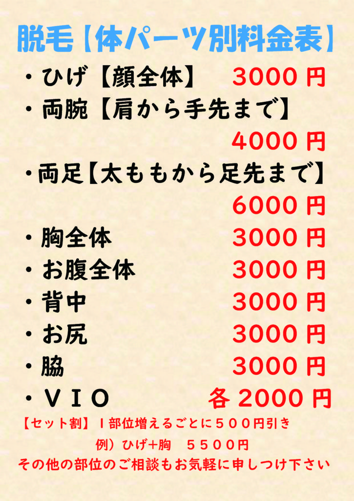 当院では初診料として3,000円を頂いております 。 価格は税抜金額です。 「キャンペーン更新期間中の施術は、下記の金額よりお安くなっております。 ●全身脱毛(男性).